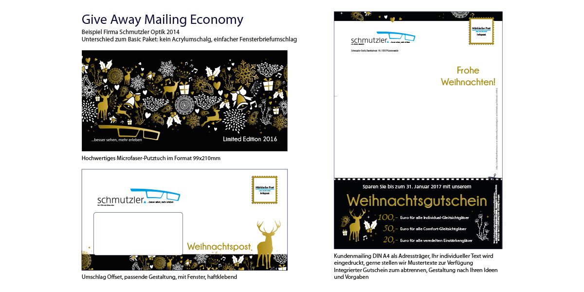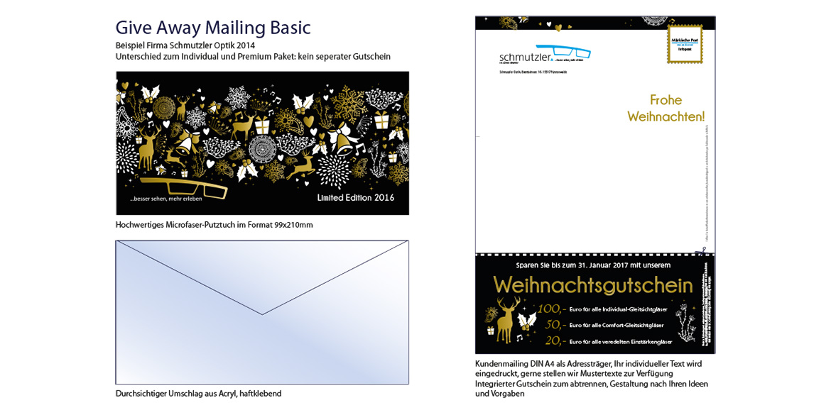 Der Kunde erhält ein auffälliges Mailing zur Weihnachtszeit, das ein hochwertiges Microfaserputztuch als Geschenk, sowie einen dazu passenden individuellen Einkaufsgutschein enthält. Der Versand erfolgt in einem hochwertigen durchsichtigen Acrylumschlag. Dieser Brief wird garantiert geöffnet! Das Kundenanschreiben, das als Adressträger dient kann für zum Bespiel für einen persönlichen Weihnachts- und Neujahrsgruß verwendet werden, oder auch auf Sonderöffnungstage zur Weihnachtszeit hinweisen.
